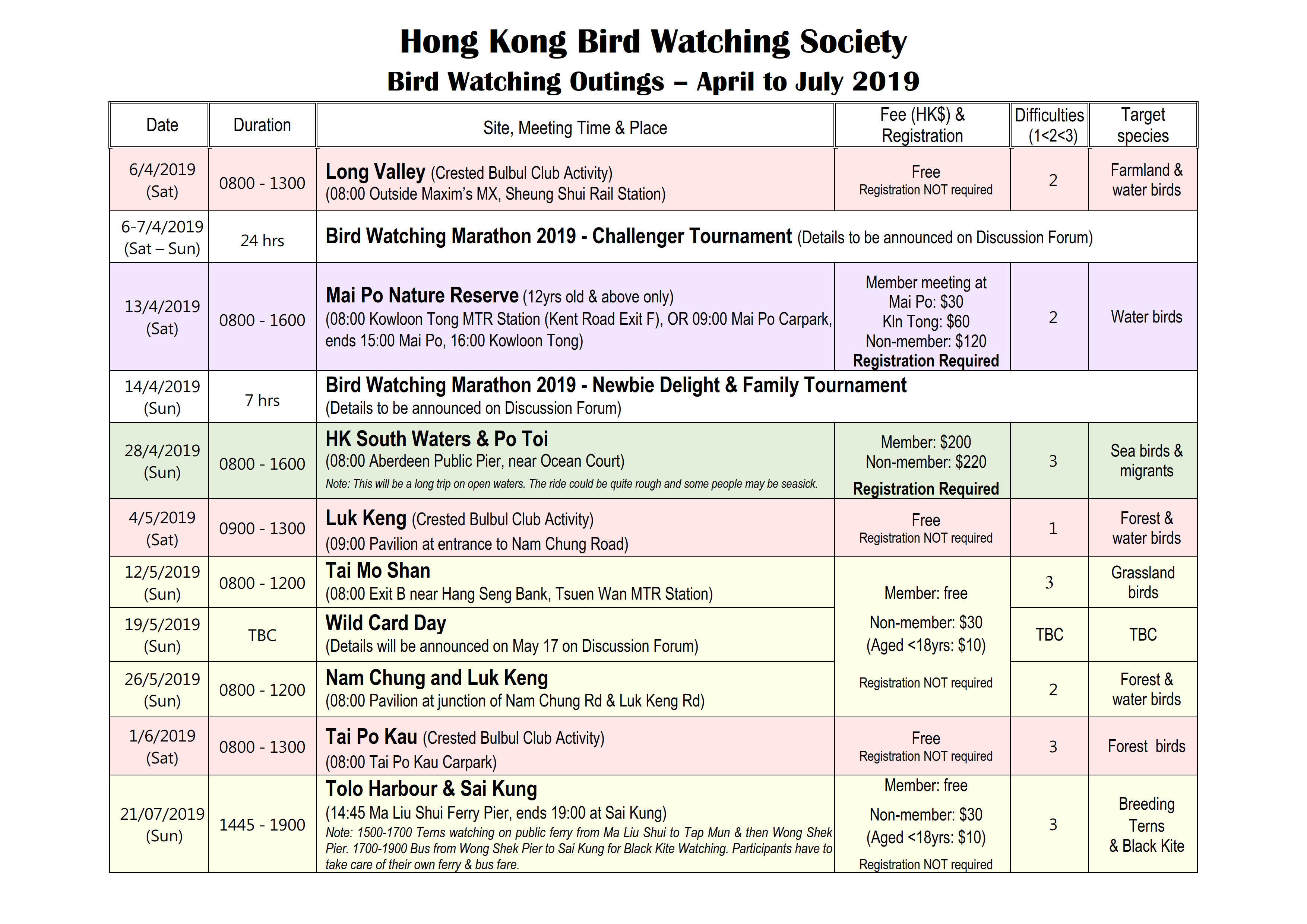 There will be a bird watching activity on 6 Apr. The gathering point is the area outside the Msxism' MX, Sheung Shui MTR station in the 1st floor. As there is some renovation work being taken place, hoardings are erected surrounding the Msxism' MX. Please note that in order to avoid any confusion, the gathering point will remain the same.