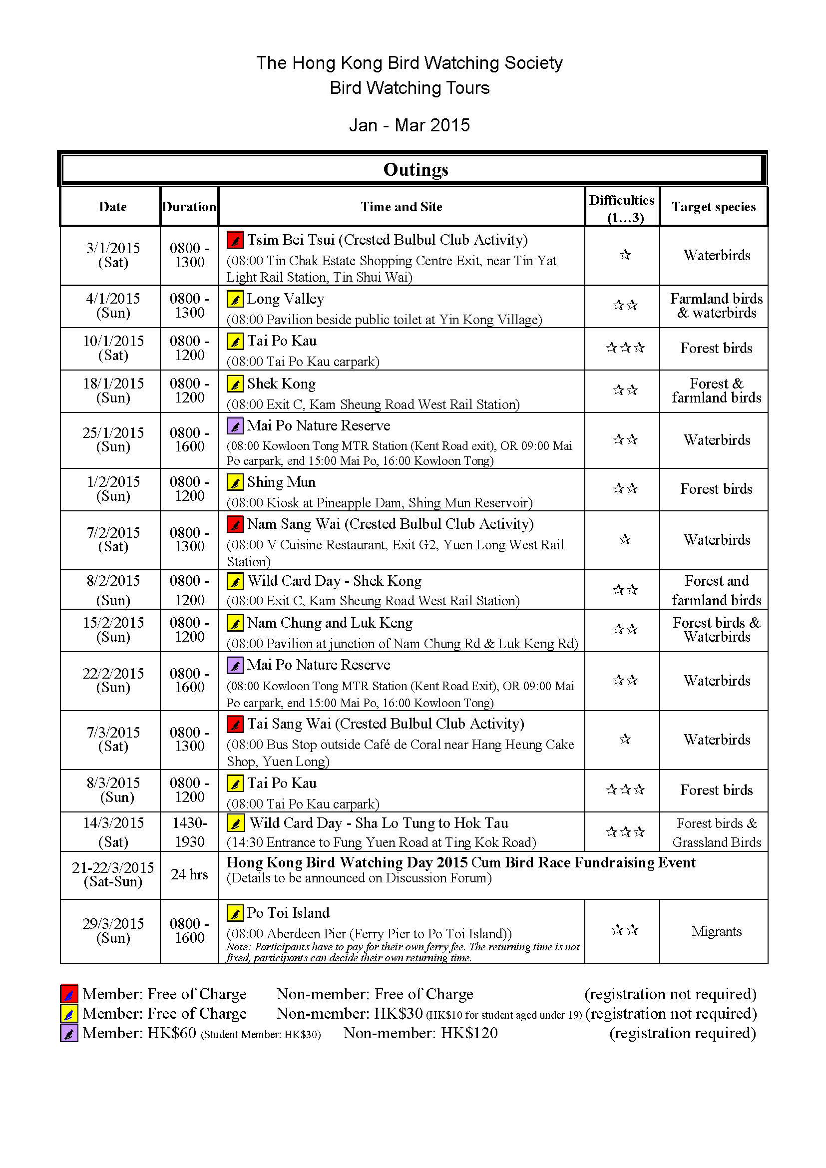 2015年1-3月戶外觀鳥活動時間表 Jan-Mar 2015 Outing Timetable