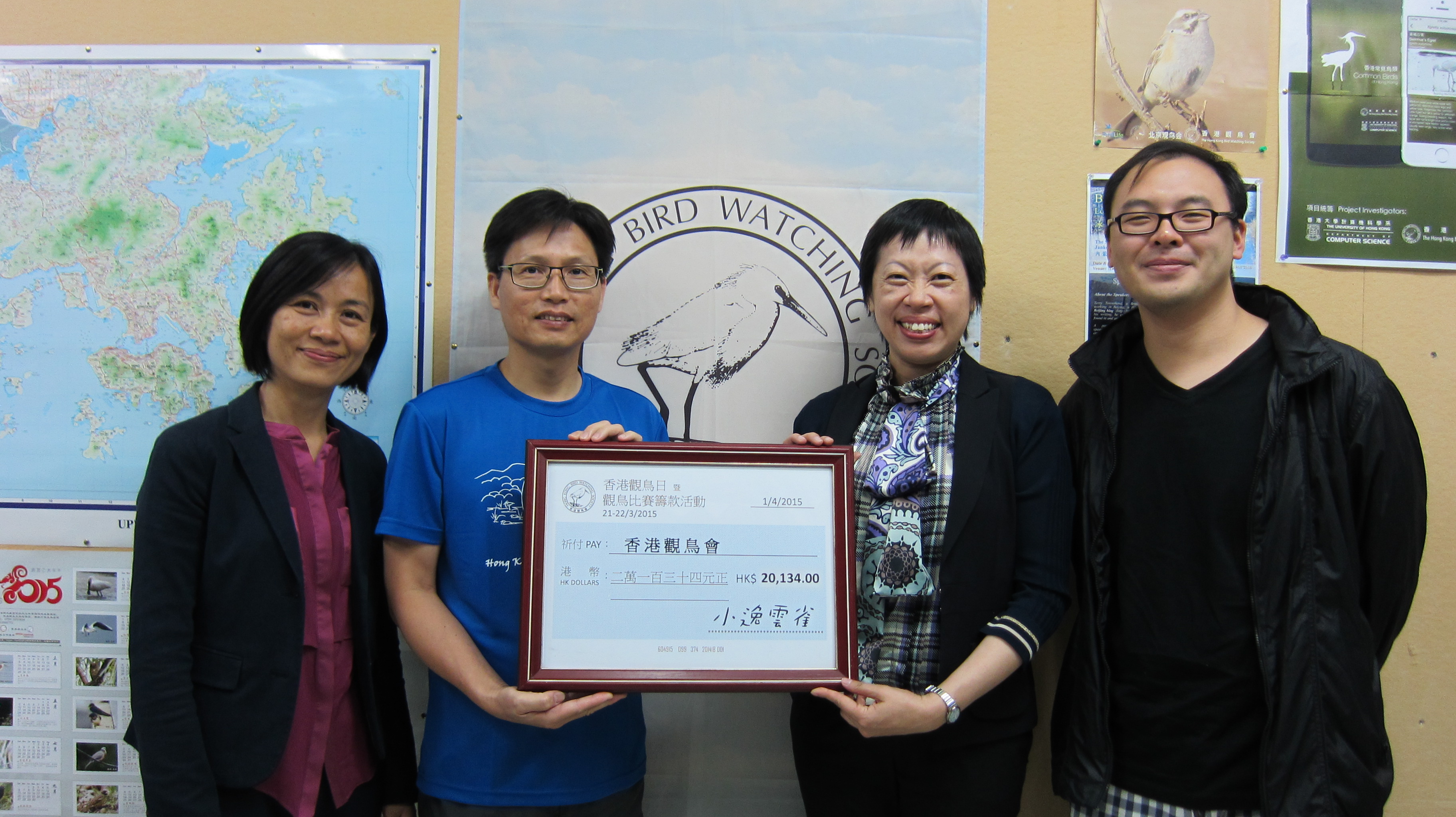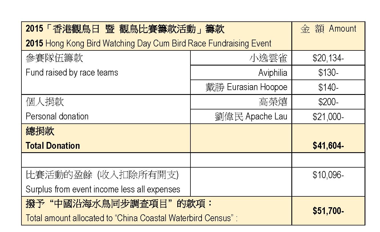 Up to 18 April, Hong Kong Bird Watching Day Cum Bird Race Fundraising Event has raised a total of HK$41,604-. Top-up with the surplus $10,096, bird race income after deduction of all expenses, a total amount of