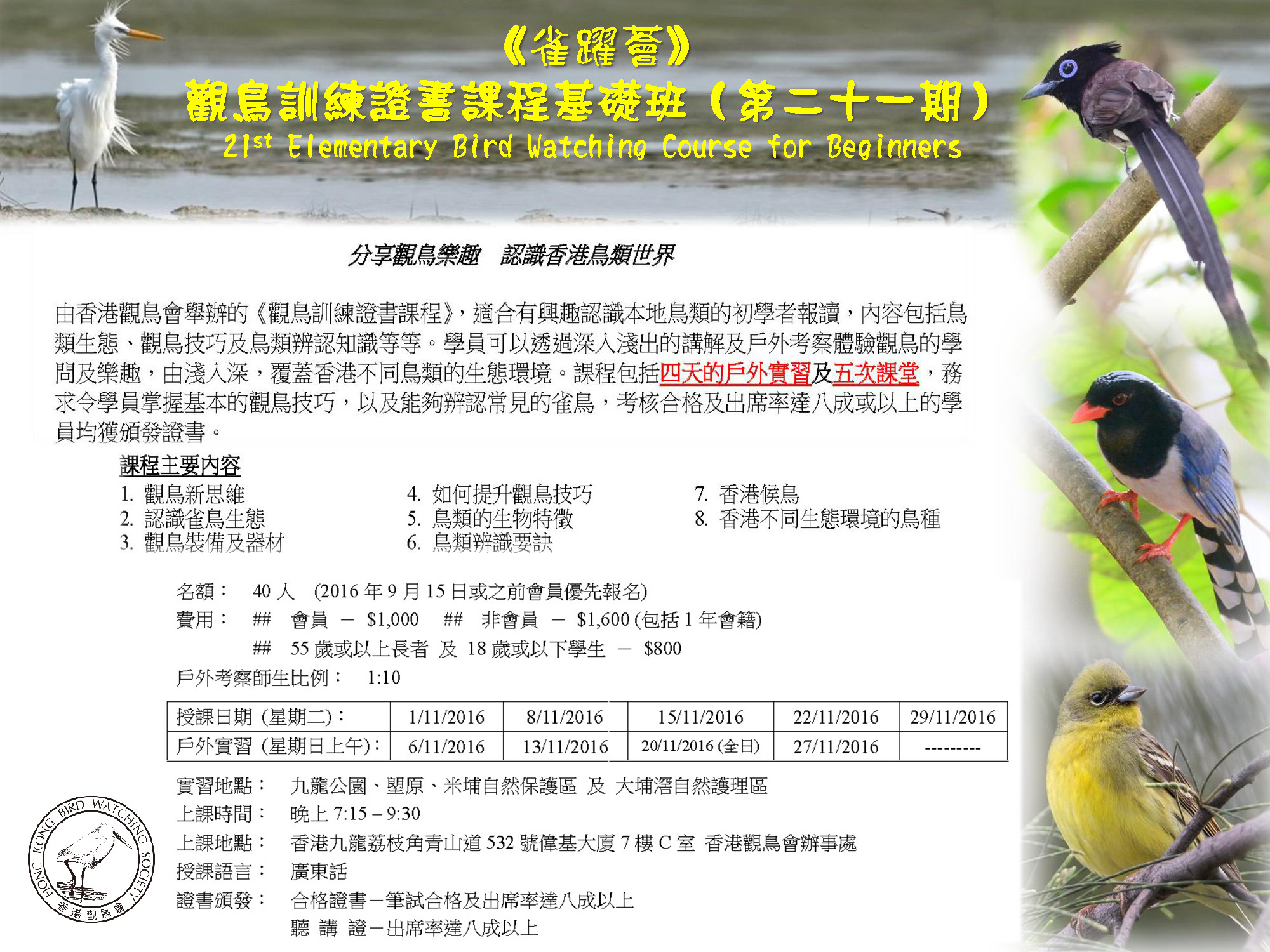 《雀躍薈》觀鳥訓練證書課程基礎班(第二十一期) 21st Elementary Bird Watching Course for Beginners
