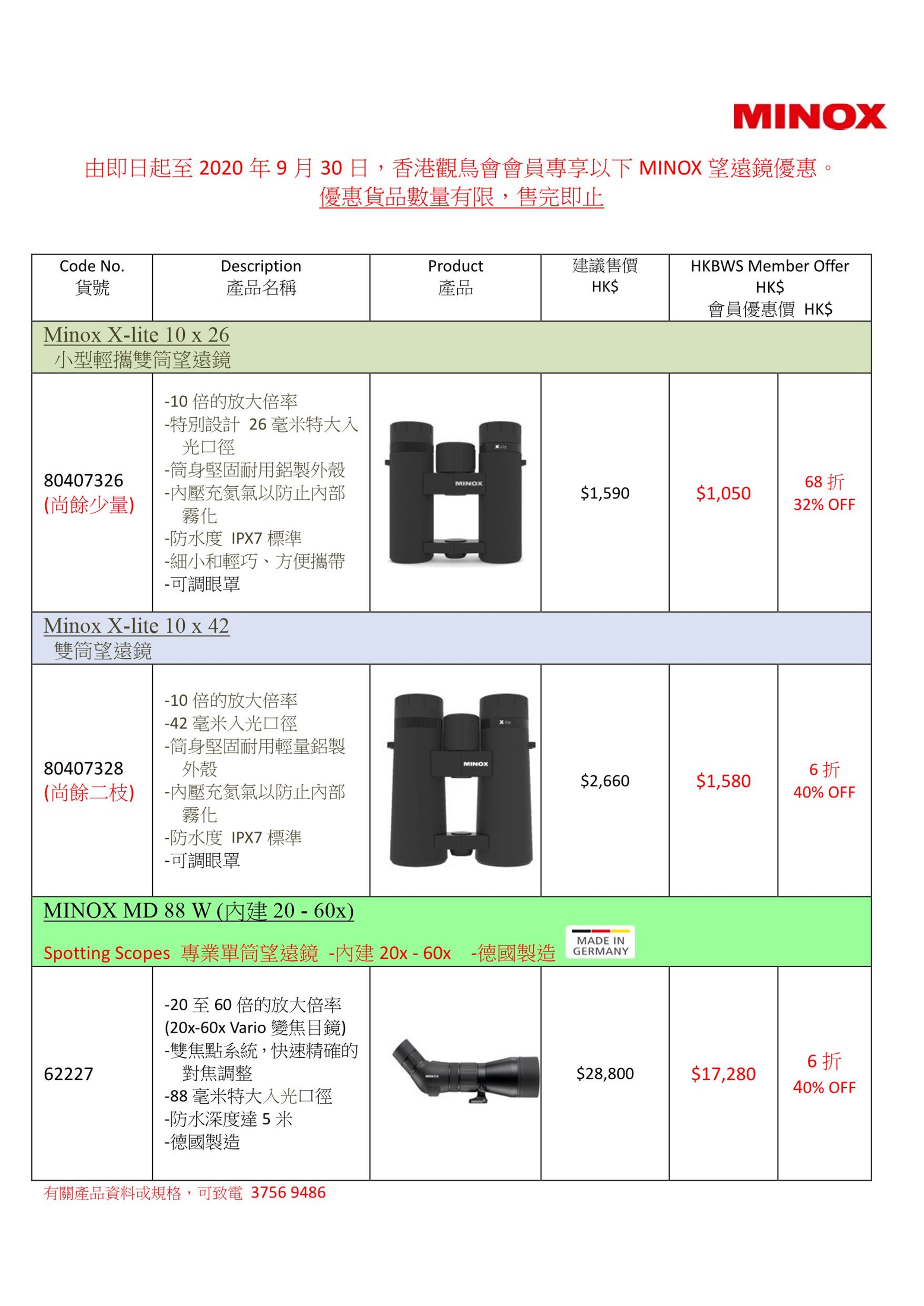 MINOX望遠鏡優惠 ~ 2020年 8月 至 9月 Special Offer of MINOX Binoculars ~ Aug to Sept 2020