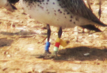 Bird 1. I think the left leg combination is actually Yellow, Red, Green. I realise the green is not very obvious on this bird, but I think that is due to the light. It is also important to note that this is a yellow flag, not a colour ring (also very important to note that this is on the lower leg). This bird is part of an ongoing study in Australia and China looking into refuelling behaviour by Great Knot, Red Knot and Bar-tailed Godwit.