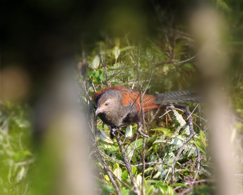 Saw this bird this morning...about 70m away and behind some thick tree trunks. Not quite like the Greater Coucal but is it the Lesser Coucal or a juvenile Greater? Please help identify.