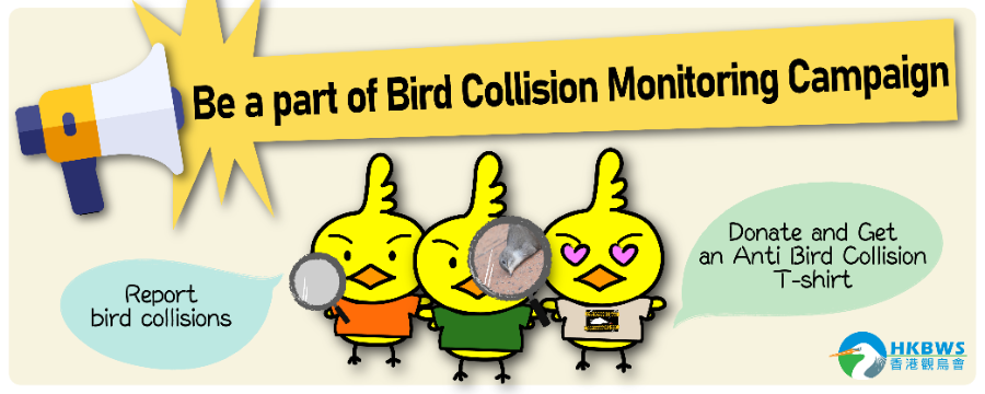 This year, we initiated the “Bird Collision monitoring Campaign” and hope to raise awareness on bird collision among the public and to work towards a bird-friendly city. With these two objectives, we will continue to strive for the reduction of bird collision black spots in Hong Kong through public education, extensive monitoring and policy advocacy. We have to take actions now and your support is needed!