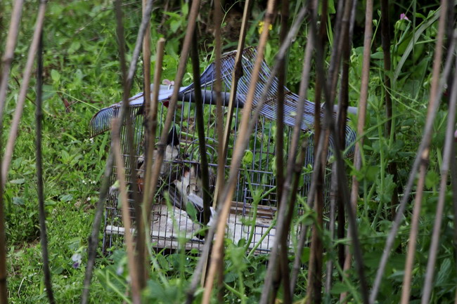 At Shui Lau Tin, Shek Kong today we came across an illegal mist net with a struggling Blackbird in it. The area also had some cage traps, baited with corn.