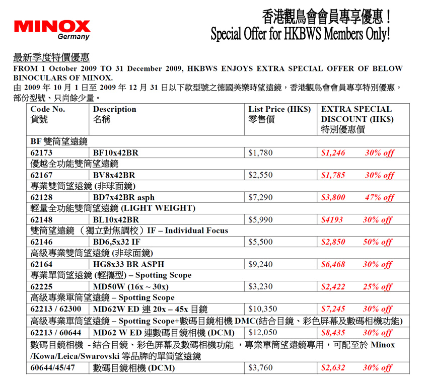 Extra Special Offer of Minox Binoculars 美樂時特選貨品再優惠