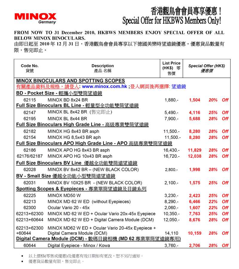 美樂時望遠鏡優惠 Special Offer of Minox Binoculars (至Till 31/12)