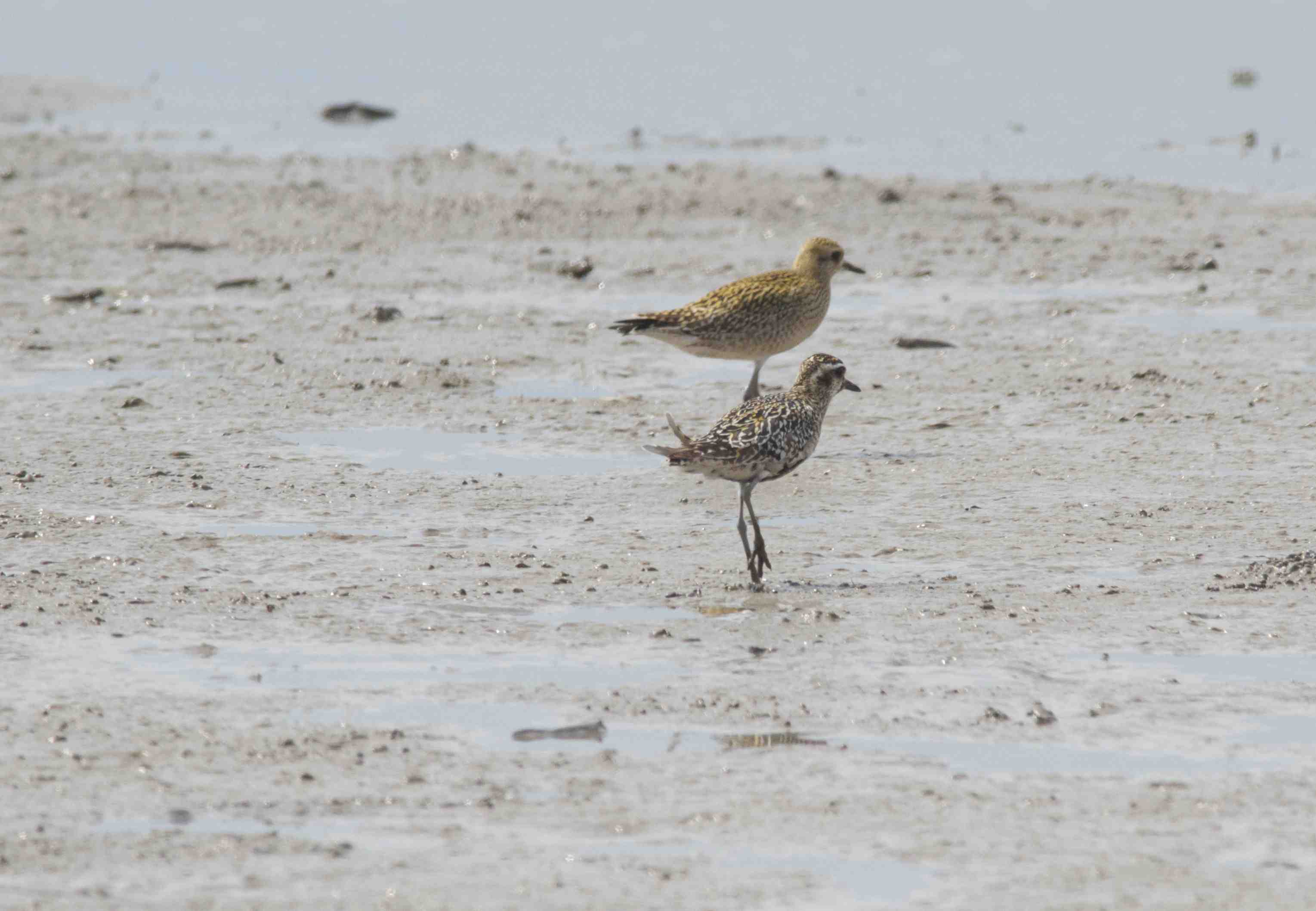 Thanks John, You got a very beautiful photo. I think both of them are Pacific Golden Plover. The golden one is an adult and the black one is a juvenile. Grey Plover (30cm) is larger than Pacific Golden Plover (23cm) alot