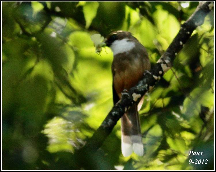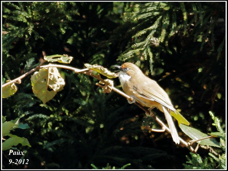 An unexpected large flock of very noisy White-throated Laughingthrush 白喉噪鶥 (probably over 30 nos.) was coming from slope below trying to fly over the vehicular path one by one. A few were scared when they were already half-way in the air & spotted me; they immediately returned to the tree top!