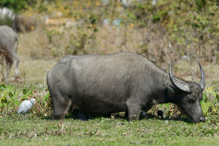In the morning of January 14th a buffalo was grazing on a wetland at Pui O Lantau Island.  It moved four five steps in every minute.  An egret followed the buffalo slavishly to pick up disturbed ticks and flies.  It is a cattle egret.