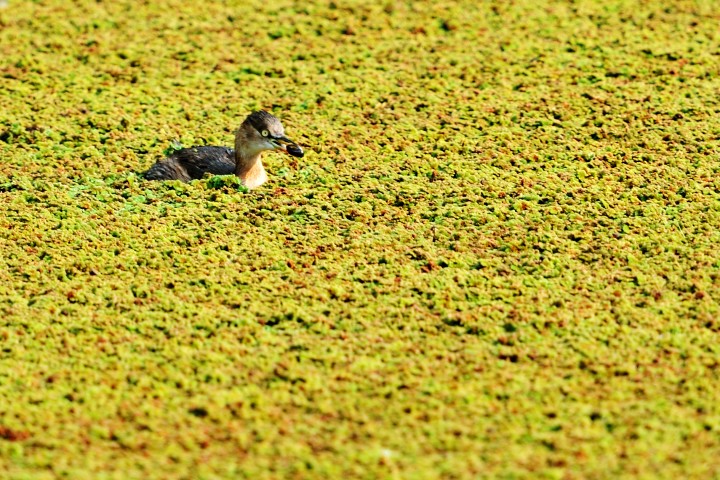 This pond at Long Valley was the habitat of a family of four common moorhens in Summer. Water weeds have outgrown in the pond and the moorhens were no where to be seen. In the morning of November 18th a little grebe appeared surfing on the water weeds picking up seeds under the water. The pond became a play field of this little grebe.