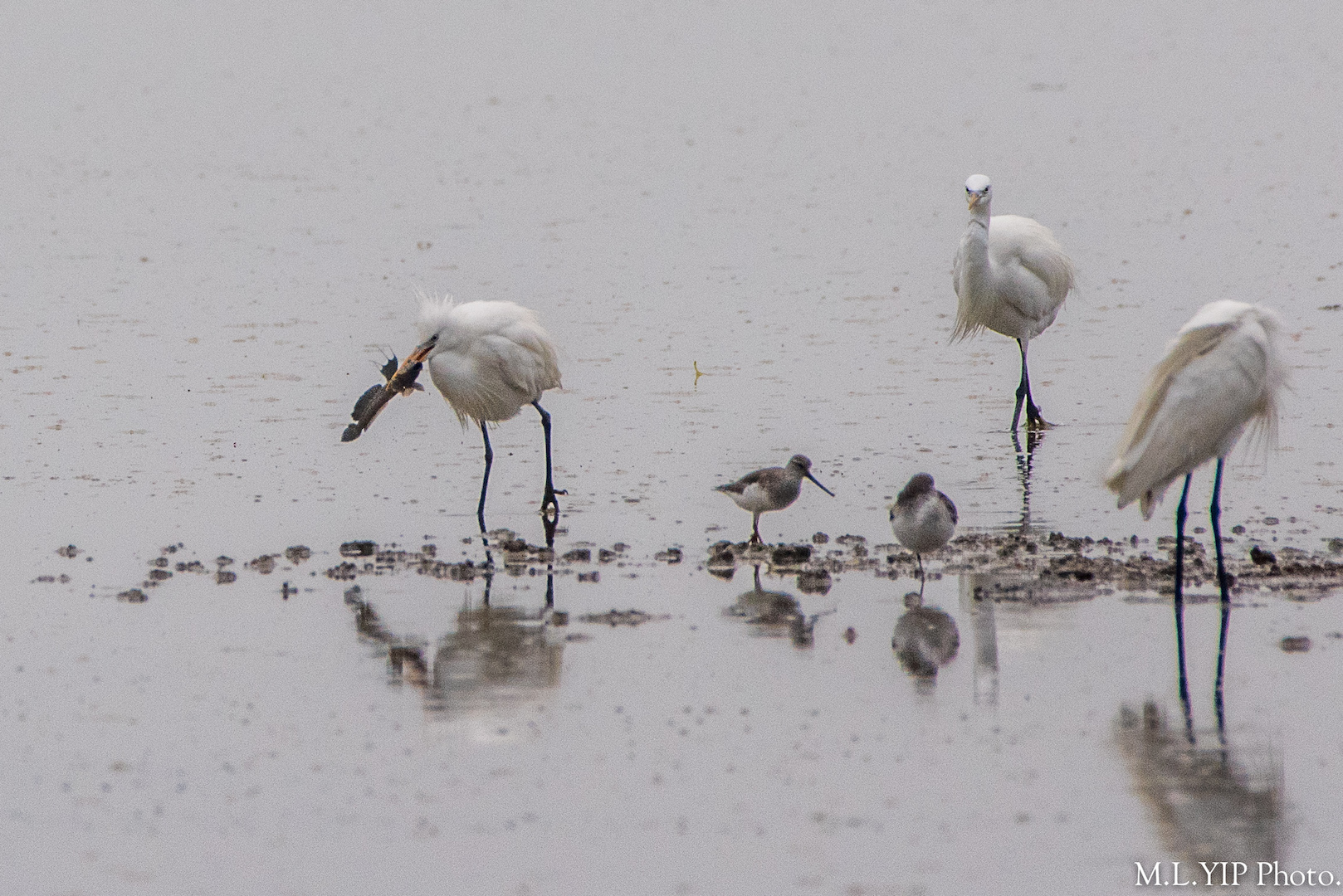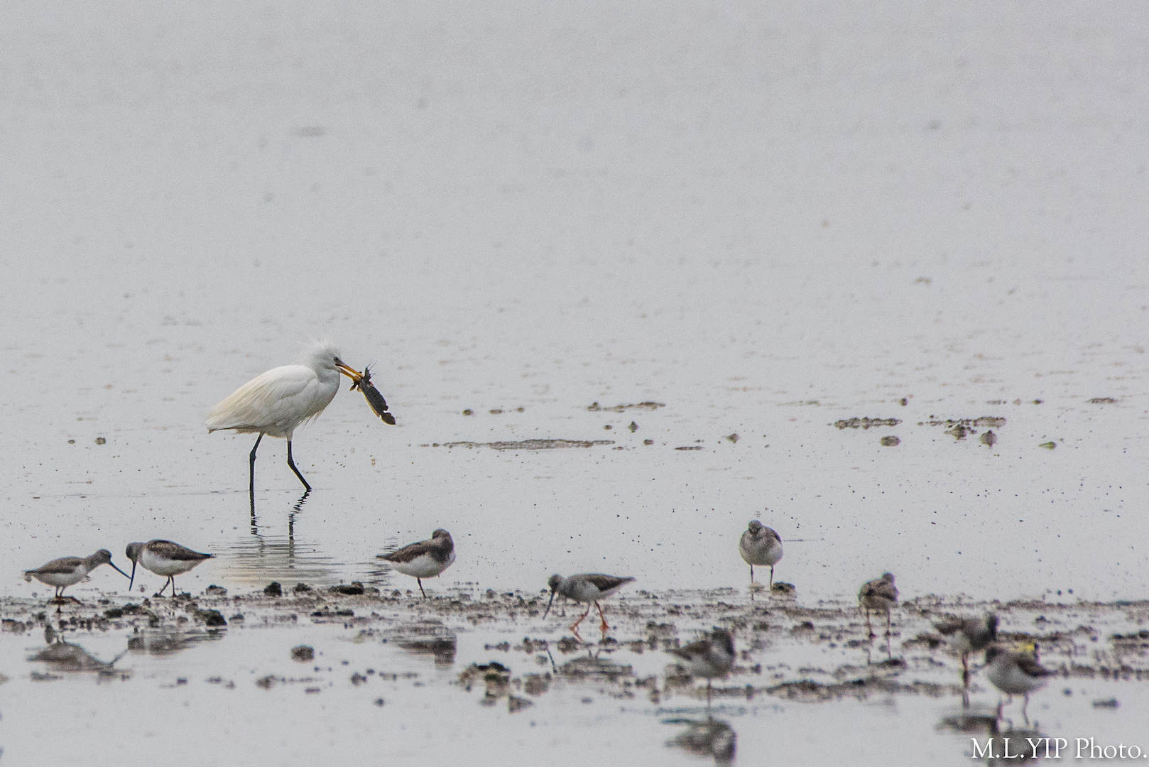 四月二十七日上午,在米埔泥灘老遠外,看到這相信是黃嘴白鷺的鳥兒,捕得一條彈塗魚, 可是馬上有大白鷺走近. 黃嘴白鷺走避了一會, 最終含著小魚拍翼而起, 然後愈飛愈遠.