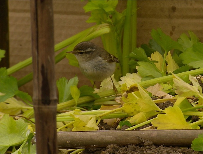 Finally, a phyllosc sp. in the veggie patch showed a clear crown stripe, but only very faint pale fringes to the tertials. I guess this could be an old and rather worn Yellow-browed Warbler, but any other opinions would be most welcome.