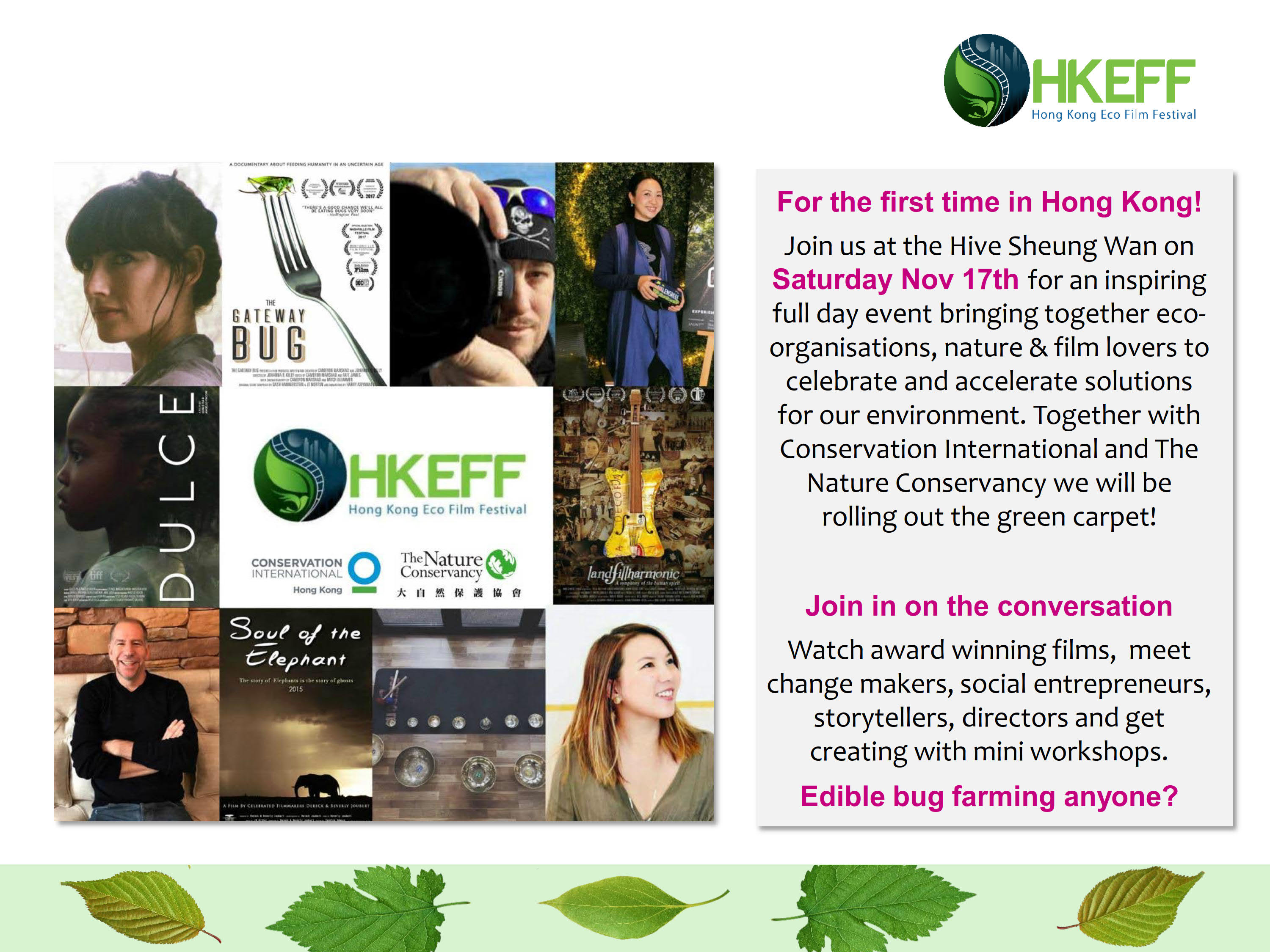 The Hong Kong Eco Film Festival (HKEFF)  is an inspirational event bringing together eco organisations, film lovers and storytellers  to celebrate and accelerate solutions for our environment.