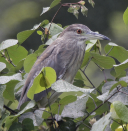 It is a Black-crowned Night Heron. You are right that the red eye is a good indicator, but this can be difficult to notice so also look for the overall grey-brown plumage, darker cap, thick bill and short, thick neck.