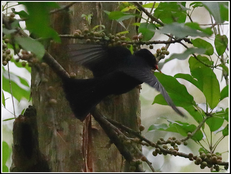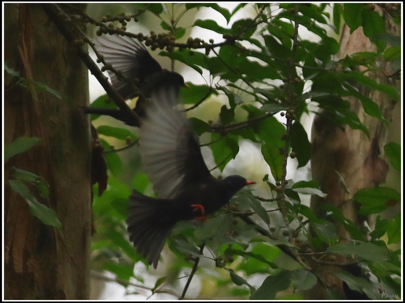 A large flock of noisy, playful Black Bulbuls stayed in the forest for a feast.