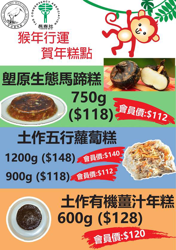今年香港觀鳥會和長春社繼續與土作坊合作,推出三款本地製作的賀年食品,包括塱原生態馬蹄糕、土作五行蘿蔔糕及有機糙米薑汁年糕。