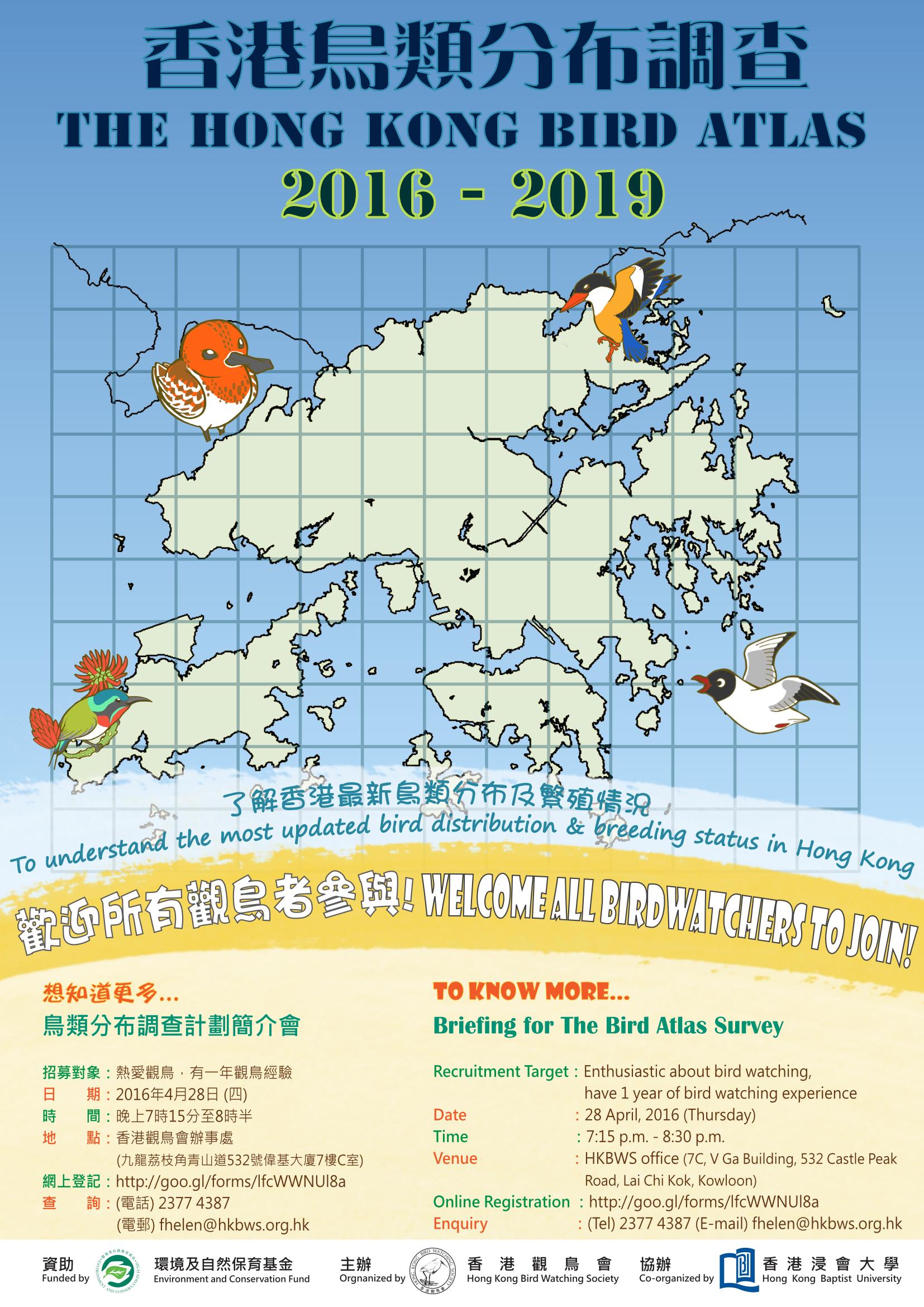 Subject: 誠邀參與香港鳥類分布調查 Invitation to HK Bird Atlas 2016-19 [Print This Page] Author: HKBWS Helen Time: 7/04/2016 18:31 Subject: 誠邀參與香港鳥類分布調查 Invitation to HK Bird Atlas 2016-19
