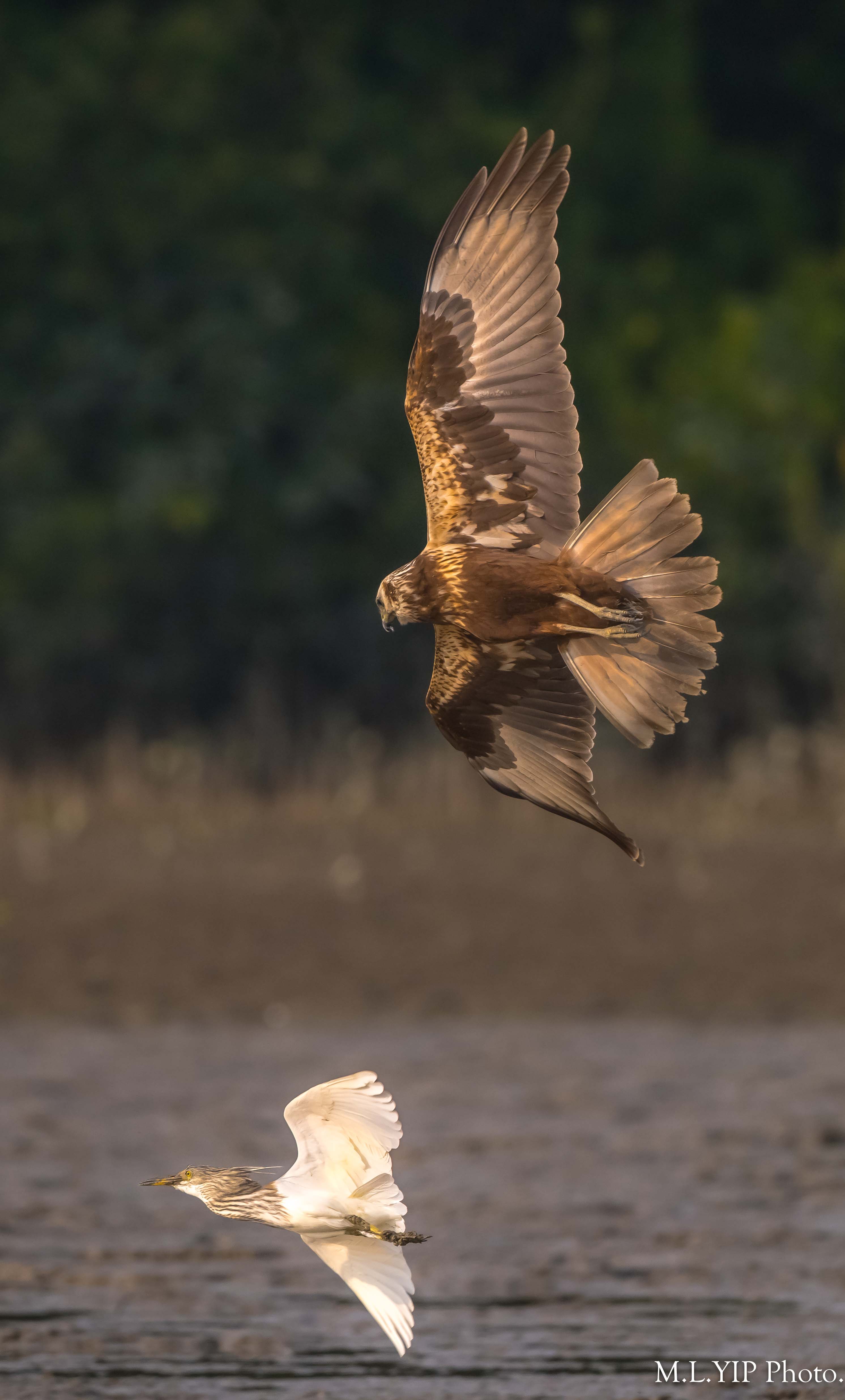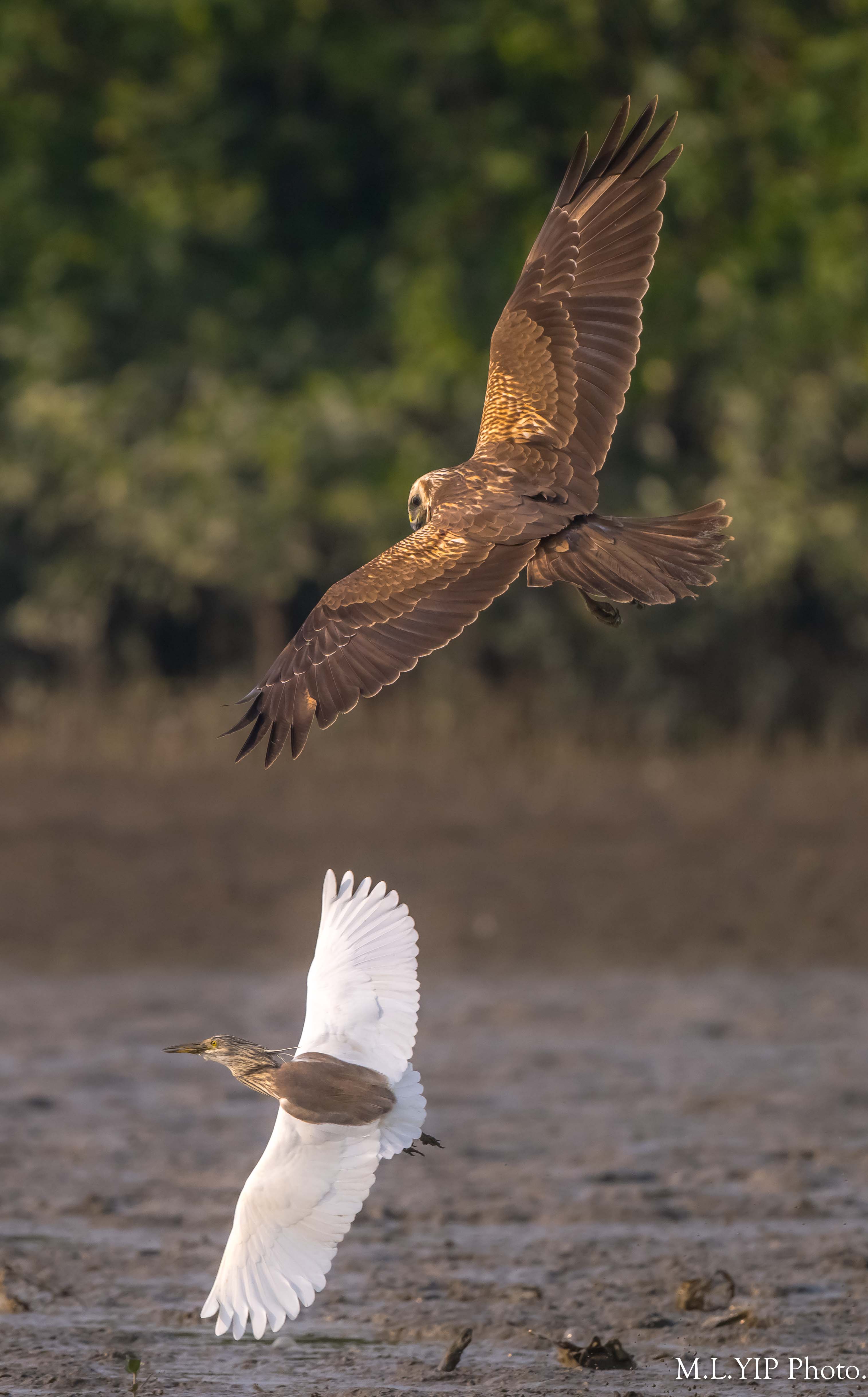橫空突然出現一隻白腹鷂,直撲泥灘上的一隻池鷺,幸好池鷺反應也敏捷,逃過了一劫.