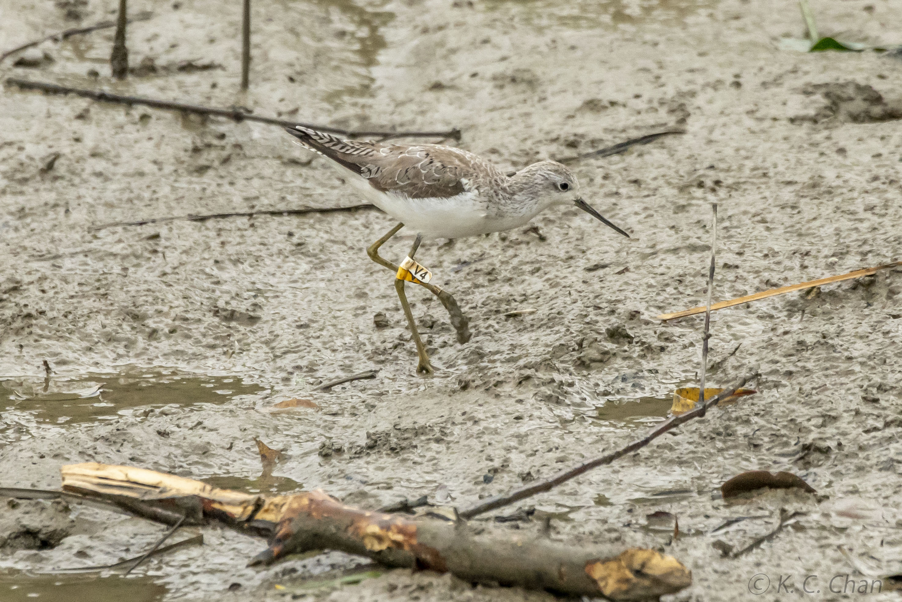 Marsh Sandpiper V4 was ringed on 11-Sep-2018. It was reported more frequently from Nam Sang Wai than Mai Po.