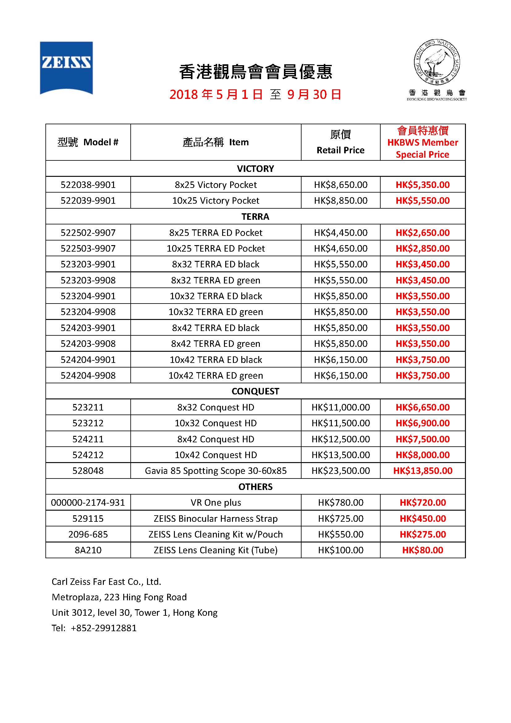 ZEISS 望遠鏡優惠 ~ 2018年05月 至 2018年09月