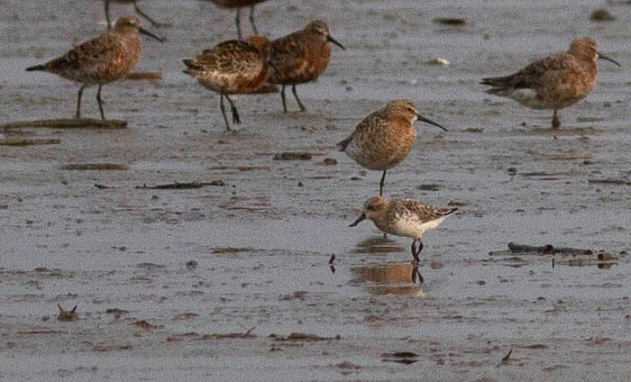 On Friday 20 April the Spoon-billed Sandpiper spent an hour on the falling tide on the green south of the outer hide. It was raining fairly hard and was quite dark, but I am attaching this pic as a document of the record. It was the same partly summer-plumaged bird that was seen on the two previous days.