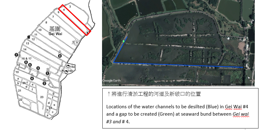 因此,今年夏季將進行生境改善工程,基圍周邊水道將於7月中至10月進行疏浚工程。清除的淤泥將會被放置在基圍周邊及水道的堤岸上。工程亦會將基圍#3/4近圍頭的橫壆做一道破口以便水流動。
