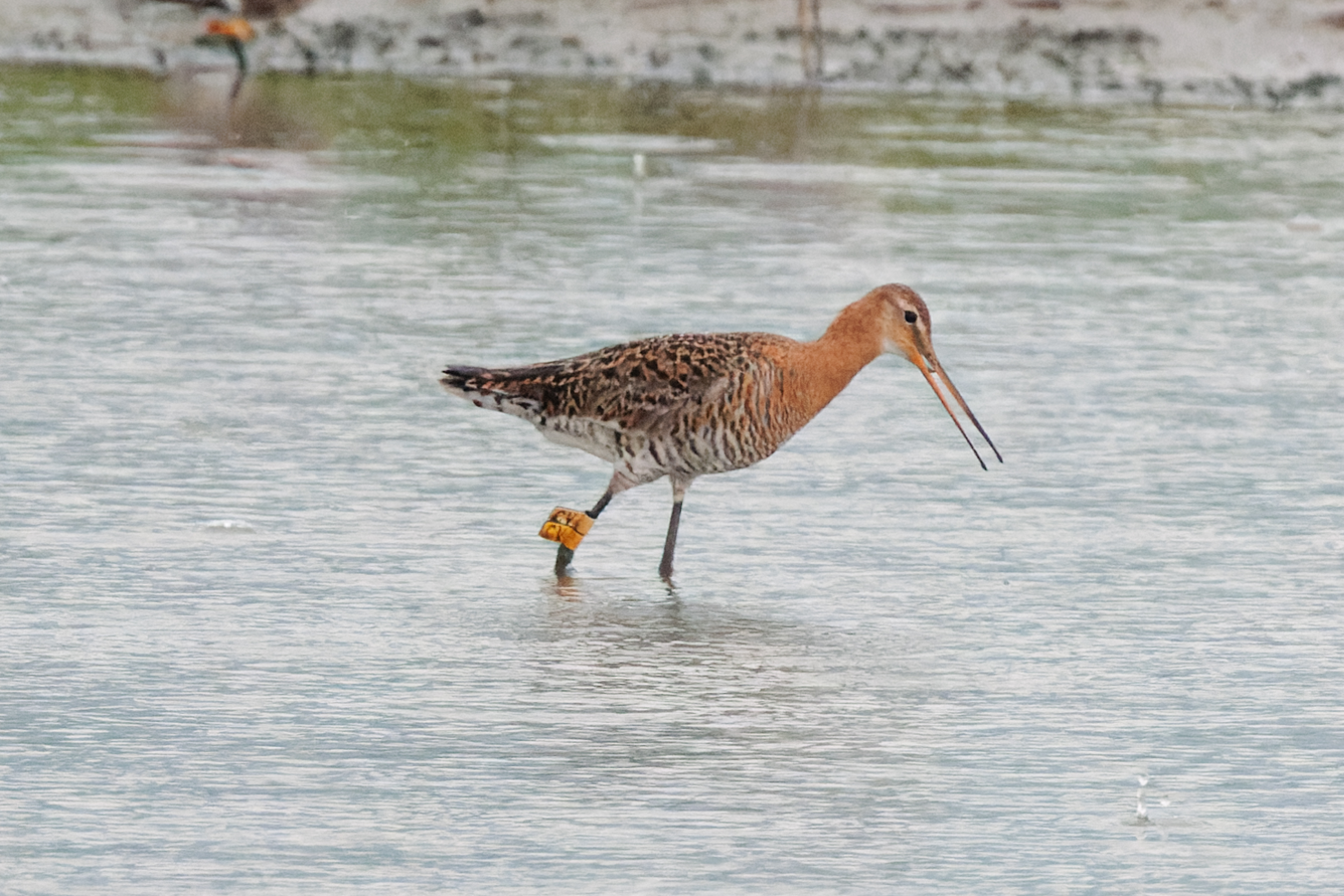 I think this is white upper flag just discoloured but may be wrong.Sighted from the scrape. Black-tailed Godwit.