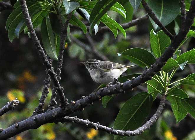 It's a very worn Yellow-browed Warbler. Note the dark shadowing behind the wing-bar (on the base of the secondaries) which is a useful feature of this species. Many of the Yellow-browed in HK at this time of year are worn like this, and appear grey and scruffy.
