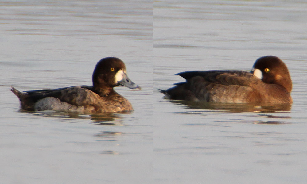 Note also the greyish mantle and flanks, the very rounded head, the diffuse dark tip to the bill, the pale spot on the cheeks and the broad bill - all classic female Scaup features.  Important to check other features as some female Tufted Duck show extensive white on the head like these birds.