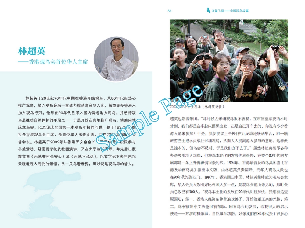 《守望飞羽》的作者采訪了接近三十位中外鳥人(當中包括林超英先生),記下他們的中國觀鳥故事——於80年代從英國來北戴河看侯鳥遷徙然後定居香港的英國人、多次為中國發現新鶯種的瑞典鳥類學家、從80年代起開始推動公眾觀鳥的北京教育家等,當然還有自90年代初開始到內地推廣觀鳥、協助內地鳥人組織鳥會的香港觀鳥會主席們和專家,他們還致力在香港推動觀鳥本土化,讓公眾認識觀鳥、參與觀鳥。這些故事不但記錄了這些鳥人的生命轉變,更見證了過去二、三十年來中國觀鳥、自然面貌和社會文化的變遷。