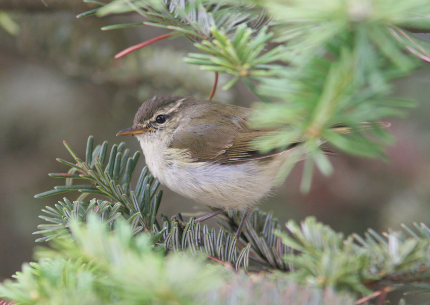 This phylloscopus warbler was in a mixed flock of Greenish and Buff-barred Warblers common on the Emeishan summit. However it had a trisyllabic / pentasyllabic loud whistle which sounded different to the disyllabic chirp of Greenish Warblers. In the second pic you can see an interesting hooked tip to the bill, which nevertheless isn't very dark as would be expected for Large-billed.