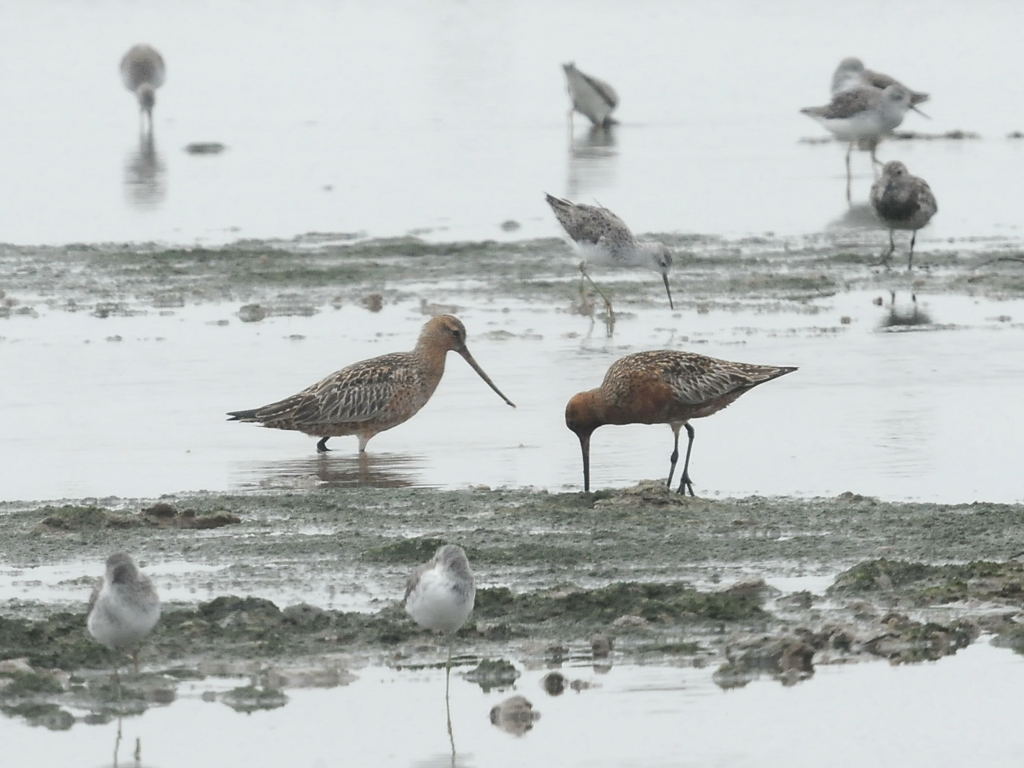 As well as bill shape, note the streaked upperparts, relatively short legs and extensive rud underparts of bar-tailed godwit. Both birds are identifiable as bar-tailed, even on the first photo