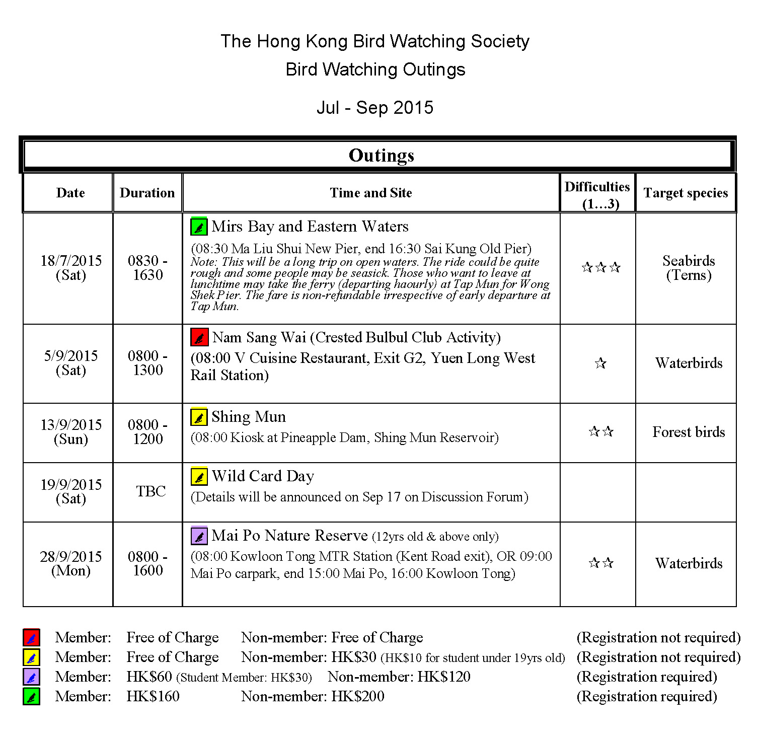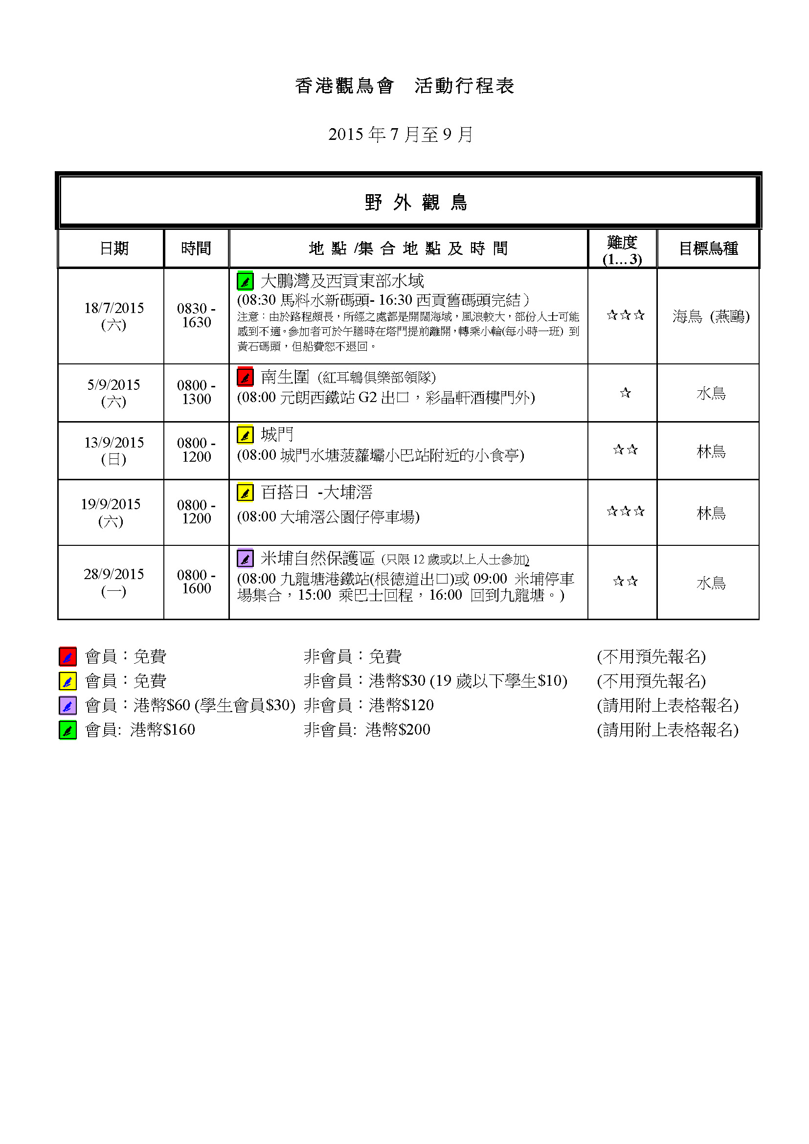 2015年7-9月戶外觀鳥活動時間表 Jul-Sep 2015 Outing Timetable
