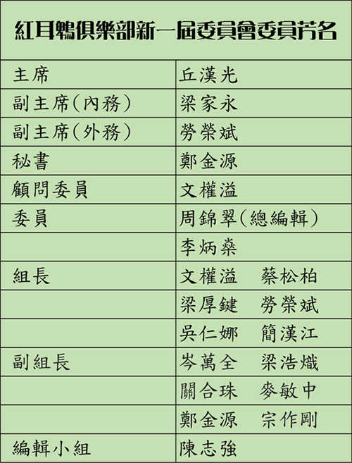 紅耳鵯俱樂部剛選出新一屆委員會委員(2017-19),芳名如下: