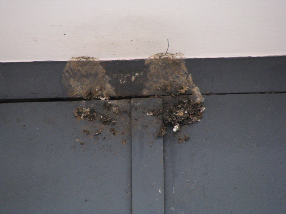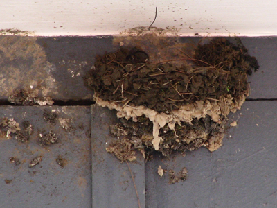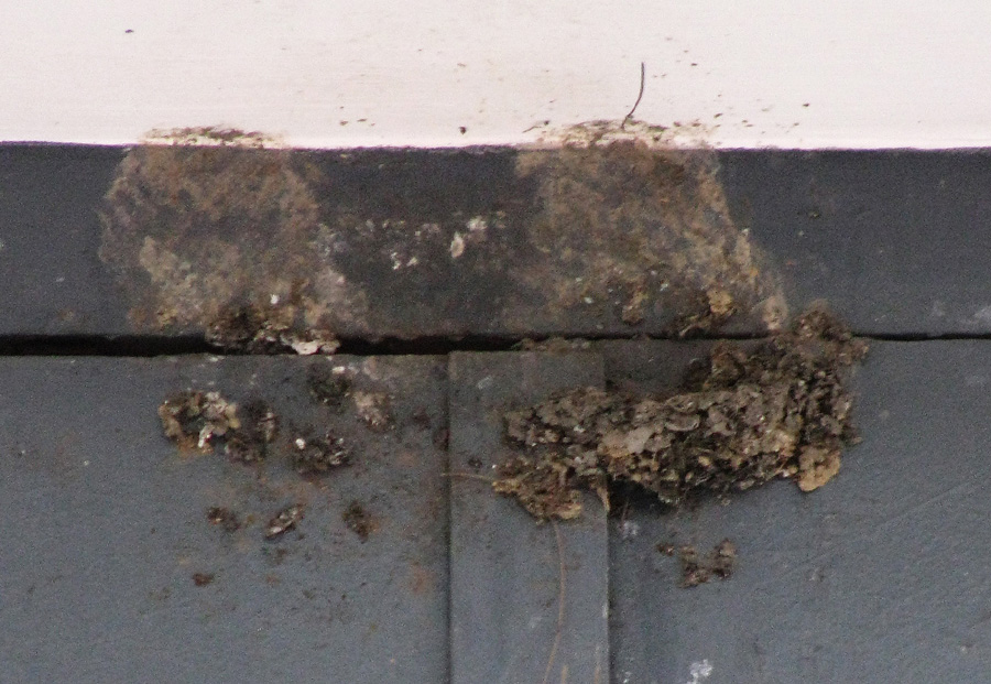 位於一電錶房門前的正中央,去年育有雛鳥,但舊巢因開門而被毀,一對家燕於今年三月初回來,現正努力在原址築巢。