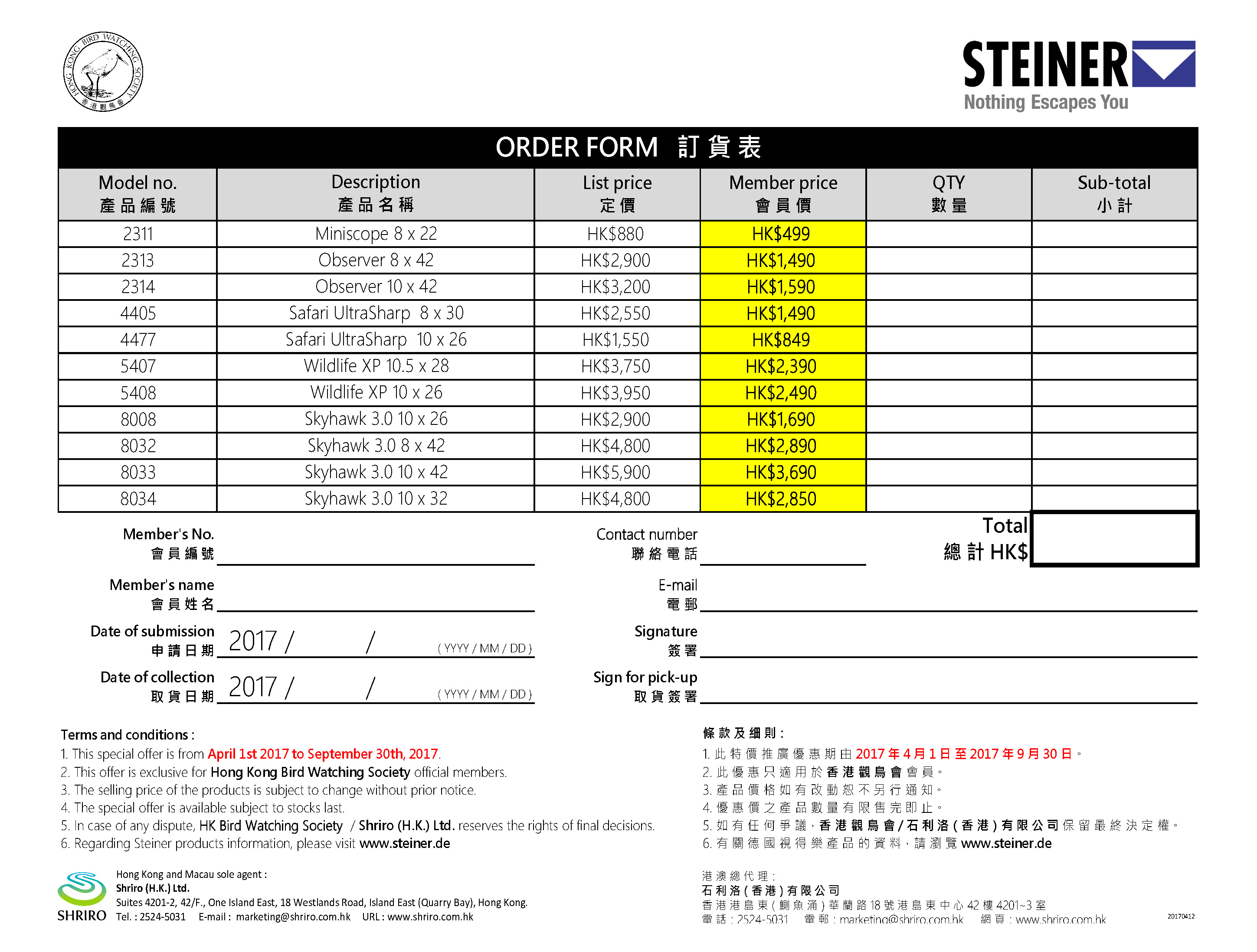 Steiner望遠鏡優惠2017/04-09 Special Offer of Steiner Binoculars