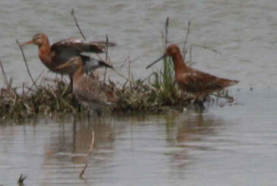 The reddest bird, on the right, is an Asian Dowitcher - note the very dark grey (if not in fact, blackish) rather tubular bill, deeper at the base.