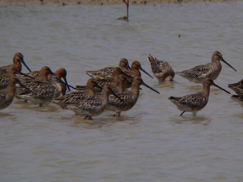 These are certainly Asian Dowitchers - the long, almost tubular, basically straight, but slightly drooping all-black bill is diagnostic.