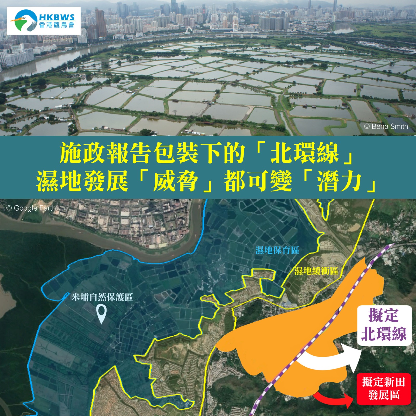 在上星期公布的施政報告,政府再次推廣「北環線」鐵路項目,稱可「帶動」新田、牛潭尾,以及凹頭的發展。這鐵路項目甚至被歸類在「土地供應」的範疇,並指已在沿線物色了總面積近四個太古城的房屋用地。可是,從地圖可見,新田一帶其實有許多魚塘,而牛潭尾和凹頭都有不少農地及濕地。而政府卻將新田等地區說成具「巨大發展潛力」,我們對此感到十分擔憂。