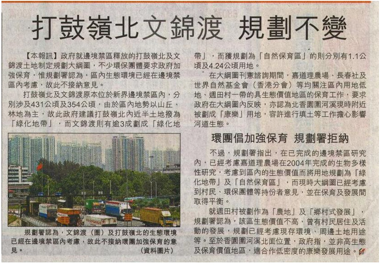 本會對粉嶺北分區計劃大綱草圖提出的意見: (這大綱草圖涉及到文錦渡路鷺鳥林)