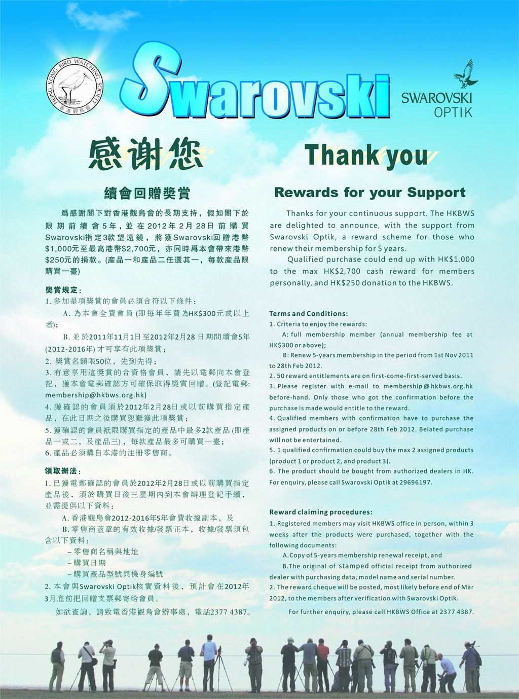 Thanks for your continuous support. The HKBWS are delighted to announce, with the support from Swarovski Optik, a reward scheme for those who renew their membership for 5 years.