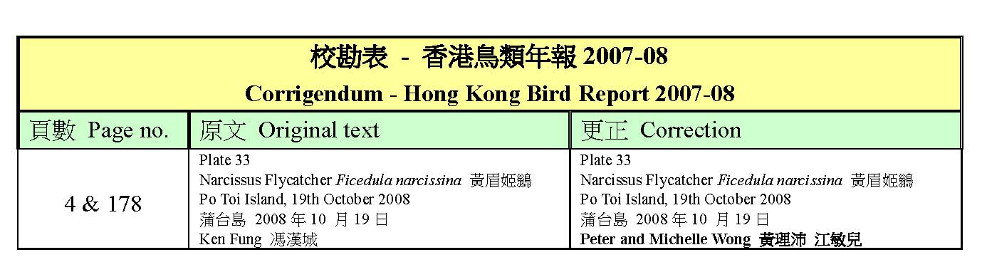 新出版的《香港鳥類年報2007-08》需經反覆校對,但抱歉仍存在一些錯誤,現更正如下,歡迎各位鳥友繼續提供有關資料,我們會不斷修正。但為了方便讀者檢閱,請把有關資料以電郵(Email- h kbws@hkb ws.org.hk) 或短消息(PM)傳給本會。