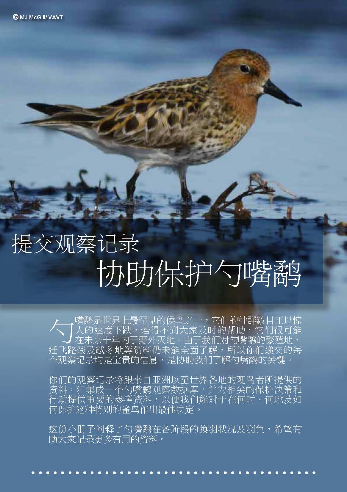 勺嘴鷸是世界上最罕見的候鳥之一,牠們的種群數目正以驚人的速度下跌,若得不到大家及時的幫助,牠們很可能在未來十年內於野外滅絕。我們需要對勺嘴鷸的繁殖地、遷飛路線及越冬地等得到充分的了解, 才能制定訂定合適的保育工作。為鼓勵大家提供有關勺嘴鷸的有用資料,勺嘴鷸工作組製作了一小冊子,闡釋了勺嘴鷸在各階段的換羽狀況及羽色,希望有助大家記錄更多有用的資料。