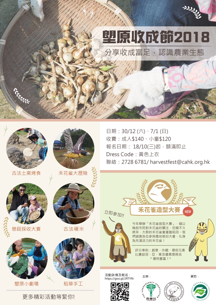 我們誠邀各位參與農地裝扮大會,化身為充滿活力的禾花雀。禾花雀,正名黃胸鵐,胸口及腹部是搶眼的黃色,背部栗子啡色,雄鳥繁殖期頭黑色及肩膀白色,體形比麻雀略大一點。從前禾花雀是農地常見的雀鳥,可惜因生境破壞,以及濫捕作為桌上佳餚,以致過去數字銳減,今天已處於瀕危的邊緣。今年舉辦「禾花雀造型大賽」,藉以喚起市民對禾花雀的關注,但願有不久將來,大群的禾花雀會重臨稻田。