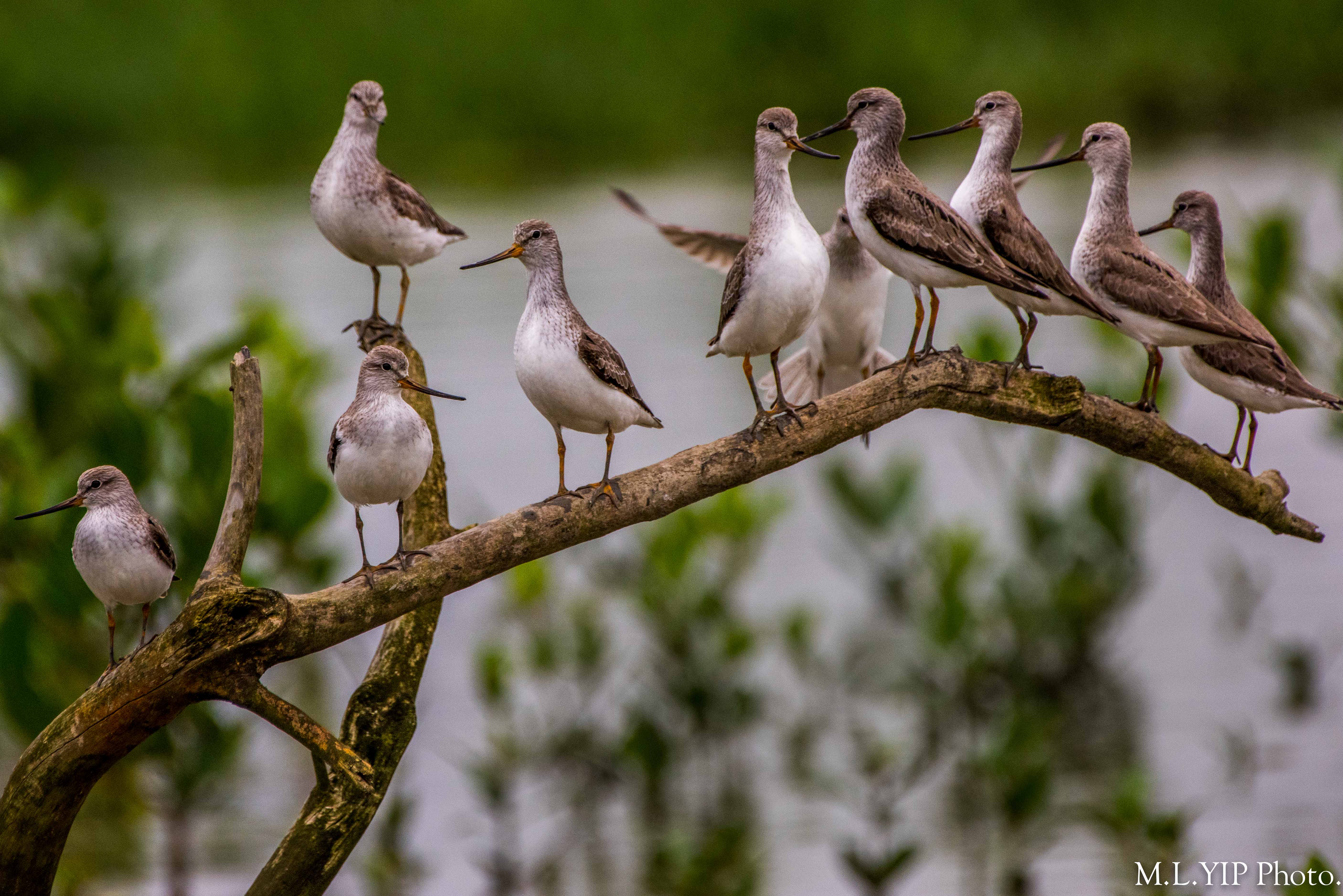 潮漲,翹咀鷸無處立足,惟有擠在一枝樹椏上.