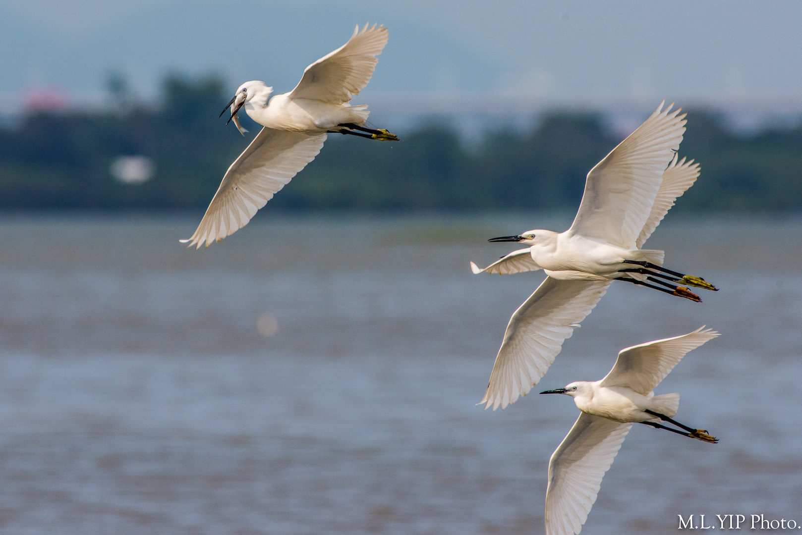 大白鷺含著魚兒空中疾飛,來逃避其它鷺鳥搶奪.