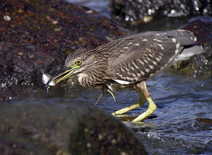 Immature Black-capped Night Heron got a bit of a surprise as it made for the large rock in front of the Man Fung Restaraunt, when it suddenly noticed me in waiting........