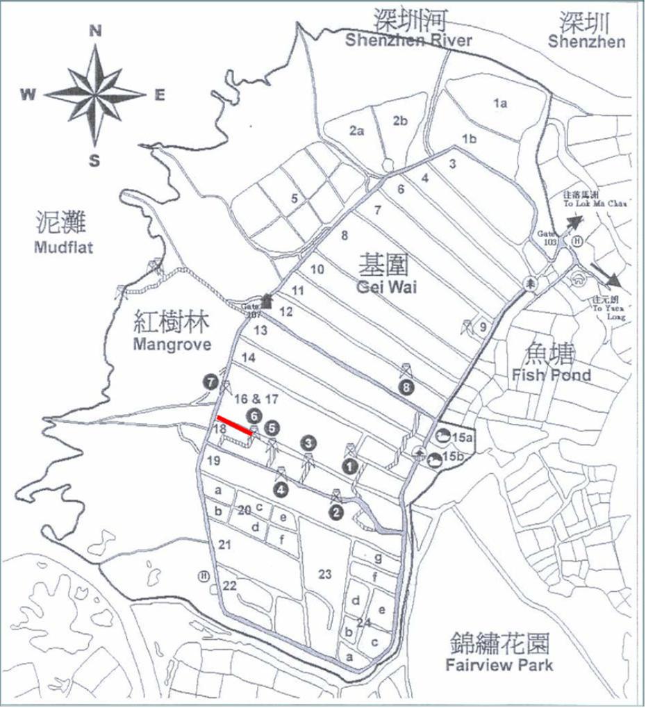 The straight bund between gei wai #17 and #18 was damaged by high water levels resulting from the typhoon on 23 Sep 2008. Three large gaps and many small holes are found along the bund after the typhoon. This makes water-level control at gei wai #16/#17 difficult. In order to maintain a suitable water level for waterbirds, the straight bund between gei wai #17 and #18 needs urgent maintenance. The contractor will use a digger to fill all the holes and gaps along the bund, extra mud will be delivered to the site to re-build the bund as same height before the typhoon. All the works will be carried out during 6 to 17 October 2008. The works will be carried out on weekdays and at times when there is not a high tide in Deep Bay and according to the “Work Timetable” provided by WWF Hong Kong.