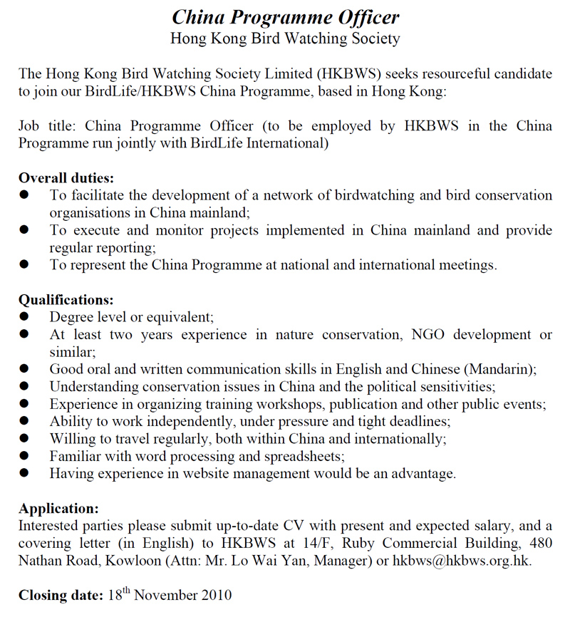 » HKBWS Job Recruitment (China Off) 香港觀鳥會職位招聘